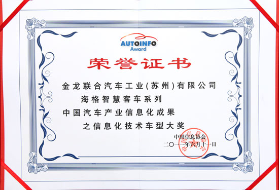 日前,在北京舉辦的2011中國(guó)汽車產(chǎn)業(yè)信息化高峰論壇暨成果獎(jiǎng)?lì)C獎(jiǎng)典禮上,蘇州金龍海格智慧客車系列榮獲信息化技術(shù)車型大獎(jiǎng),成為客車行業(yè)唯一上榜的品牌。上市一年來(lái),海格智慧客車以無(wú)可阻擋的魅力,接連斬獲中國(guó)客車創(chuàng)新大獎(jiǎng)、“中國(guó)道路運(yùn)輸杯最佳創(chuàng)新獎(jiǎng)”,上榜交通運(yùn)輸部節(jié)能減排示范項(xiàng)目。3月25日,在蘇州啟動(dòng)的全國(guó)道路客運(yùn)“海格智慧”科技技助力行動(dòng),目前已席卷大半個(gè)中國(guó),更是給整個(gè)行業(yè)帶來(lái)深遠(yuǎn)影響。
