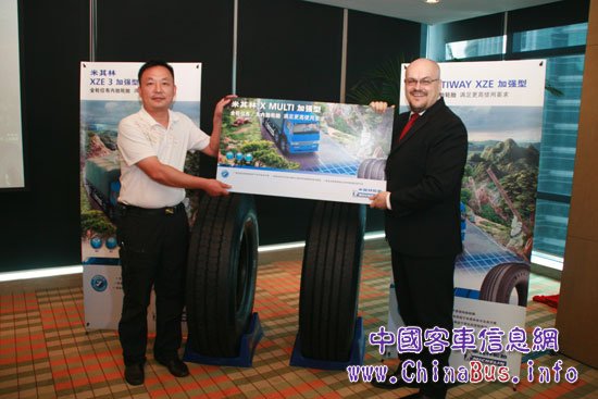 米其林(中國(guó))投資有限公司卡客車(chē)輪胎部市場(chǎng)總監(jiān) 法蘭克葉先生與米其林輪胎先生共同為新產(chǎn)品揭幕