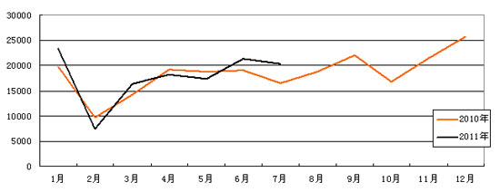 7月,中國客車統(tǒng)計(jì)信息網(wǎng)的50家客車企業(yè)共計(jì)銷售客車20314輛,同比增量3873輛,增長23.56%,1-7月累計(jì)銷售客車124226輛,同比增幅繼續(xù)放大,累計(jì)增幅上升到6.13%。如圖所示,今年上半年客車月度銷量曲線與上年曲線走勢(shì)基本一致,1月高開,2月回落,3月反彈,4月、5月連續(xù)下滑,6月強(qiáng)勢(shì)突破,僅僅6個(gè)月兩條曲線就發(fā)生4次緊密纏繞,這在以往年度十分少見。7月份,客車銷量的同比增幅是今年以來的最高增幅,也是今年以來第一次連續(xù)兩個(gè)月取得正增長,客車市場不僅維持了6月份以來的強(qiáng)勢(shì)格局,而且使下半年的市場走勢(shì)獲得了一個(gè)良好的開局。
