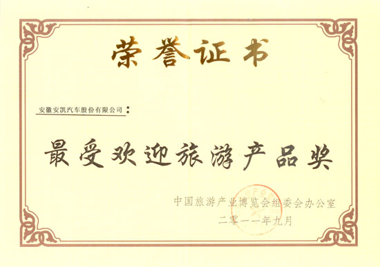 最受歡迎旅游產(chǎn)品證書