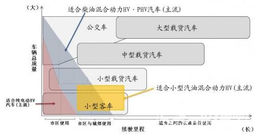 這里有一張日本《下一代汽車發(fā)展戰(zhàn)略(2010)》中公布的“各類車輛電動化適應(yīng)性概念圖”,細(xì)看與歐陽明高的觀點有異曲同工之處。