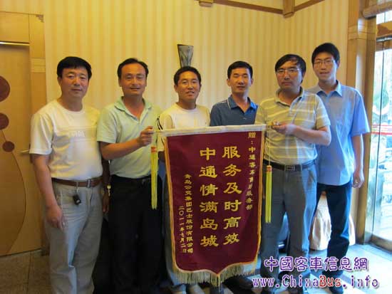 青島公交集團(tuán)巴士公司總經(jīng)理于飛將題有“服務(wù)及時(shí)高效 中通情滿島城”的錦旗送給中通