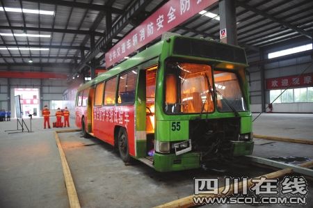 場上停著一輛綠色CFC6110D型公交車,正是與成都“6·5”放火案同類的車型。當(dāng)時(shí)車窗已全部關(guān)嚴(yán),車廂內(nèi)的上方安置了一根管道,管道上有幾個(gè)噴頭,過道的地上放置了格子,里面傾倒了汽油。車的頭尾部,科研人員作了控制、驅(qū)動等裝置的試驗(yàn)改動,一根長長的軟管通到控制臺處。