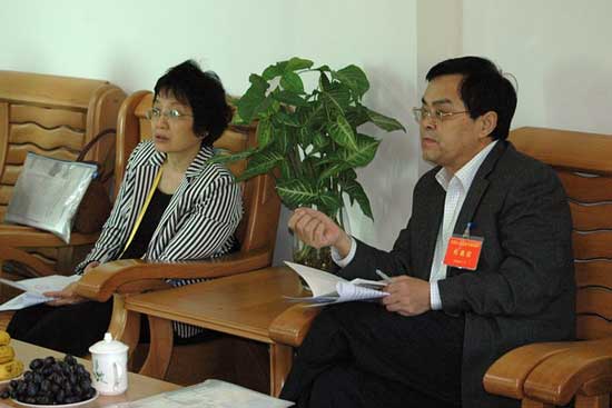 全國(guó)人大代表賀優(yōu)琳(右)仔細(xì)聽(tīng)取學(xué)校負(fù)責(zé)人關(guān)于校車安全保障的匯報(bào)