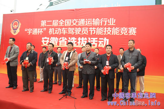 10月28日上午,由安徽省交通運(yùn)輸廳主辦,省公路運(yùn)輸管理局承辦,合肥市運(yùn)管處、合肥市汽車(chē)客運(yùn)有限公司協(xié)辦的第二屆全國(guó)交通行業(yè)“宇通杯”機(jī)動(dòng)車(chē)駕駛員節(jié)能技能競(jìng)賽安徽省選拔賽在省會(huì)合肥市濱湖新區(qū)舉行。安徽省交通廳人事教育處處長(zhǎng)姜蕓、綜合運(yùn)輸處處長(zhǎng)江宗法、省交通工會(huì)主席翟光炯以及省公路運(yùn)輸管理局黨委書(shū)記梁程等相關(guān)領(lǐng)導(dǎo)出席活動(dòng)現(xiàn)場(chǎng),合肥等7個(gè)市運(yùn)管處、阜陽(yáng)市等10個(gè)專業(yè)汽車(chē)運(yùn)輸公司的工會(huì)領(lǐng)導(dǎo)及眾多媒體的記者也來(lái)到現(xiàn)場(chǎng)觀摩比賽。