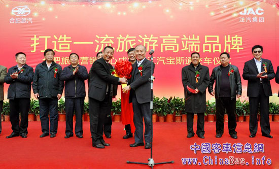 2011年12月8日,在合肥新亞汽車(chē)客運(yùn)公司的停車(chē)場(chǎng)內(nèi),伴隨著江淮汽車(chē)集團(tuán)董事長(zhǎng)左延安將金鑰匙交到合肥旅汽總經(jīng)理黃石林的手中,12輛嶄新的江淮寶斯通客車(chē)亦將正式入駐合肥客運(yùn)旅游汽車(chē)公司(以下簡(jiǎn)稱(chēng)“合肥旅汽”)。