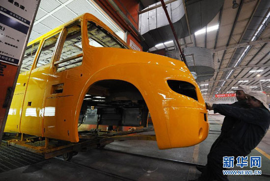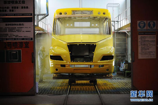 工人在為“最牛校車”車體噴漆(12月22日攝)。