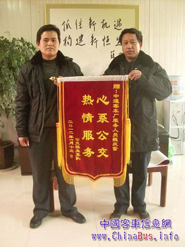 元月15日,中通客車服務部山東辦事處服務人員魏慶雷收到了一面寫有“熱情服務 心系公交”的錦旗,這是濟南恒生公交公司負責人送來的,以感謝魏慶雷及其他服務人員熱情、及時、周到服務工作的。