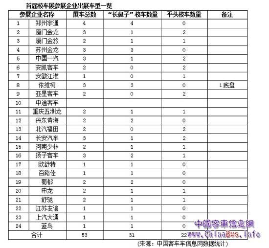 鄭州宇通、蘇州金龍、丹東黃海、依維柯、蜀都、百路佳、歐舒特、、友誼、大通和美國(guó)藍(lán)鳥等10家企業(yè)的參展校車全部為“長(zhǎng)鼻子”,總計(jì)達(dá)19款。