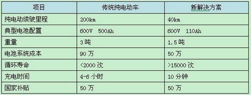 ▲ 公交客車只需配置60kWh左右的電池組,滿足單程或者一次往返的續(xù)駛需要。電池組成本較一般純電動客車設(shè)計需要的300kWh大大降低,其重量也極大減輕;