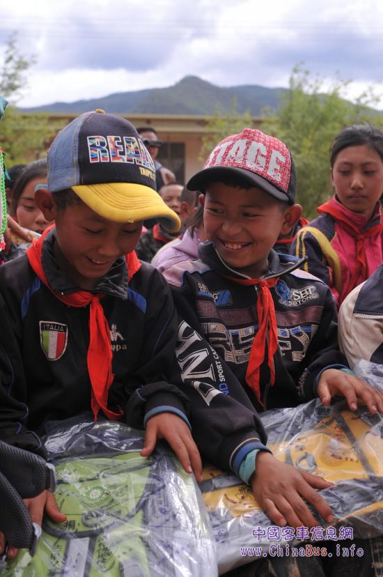芒果v基金和海格客車給孩子們送上書(shū)包作禮物