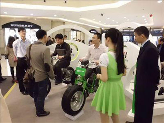 消費(fèi)者在三輪車體驗(yàn)區(qū)體驗(yàn)