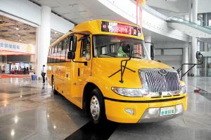 長(zhǎng)沙梅花汽車制造公司生產(chǎn)的大、中、小3款“金象牌”安全智能校車閃亮登場(chǎng),成為車展的一大亮點(diǎn)