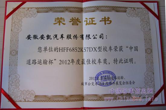 2012年5月16日,安凱新國標校車HFF6852K57DX在由交通運輸部主辦的“中國道路運輸杯”頒獎典禮上榮獲“2012年度最佳校車獎”,安凱HFF6100K82D型公路客車獲得“2012年度最佳公路客車獎”,安凱客車在本次中國交通展上載譽而歸。