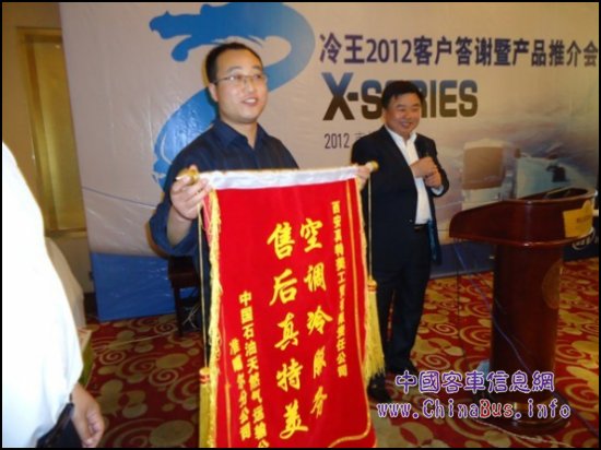 會議在冷王中國區(qū)銷售及服務總經理崔景潭先生的精彩致辭中拉開序幕(圖1),隨后客戶代表油田客運公司常務副總秦玉文熱情洋溢地回顧了和冷王的7年合作歷程(圖2),中石油準噶爾運輸公司常務副總任新偉代表中石油運輸公司表揚了冷王的優(yōu)質服務,并當場授予代理商西安真特美工貿有限責任公司服務表彰錦旗(圖3),贏得了大家陣陣掌聲。接下來,冷王中國區(qū)銷售及服務總經理崔景潭先生給大家做了冷王公司介紹,讓大家對冷王公司和冷王產品有了更深入了解;最后冷王巴士銷售經理吳健給大家做了冷王全新客車空調X系列推介報告,專業(yè)的講解輔以清晰的圖片,贏得客戶的廣泛認可。會后大家在歡快的氣氛中進行了晚宴,加深了友誼。