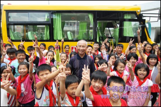 “十九公”和孩子們在海格校車前合影