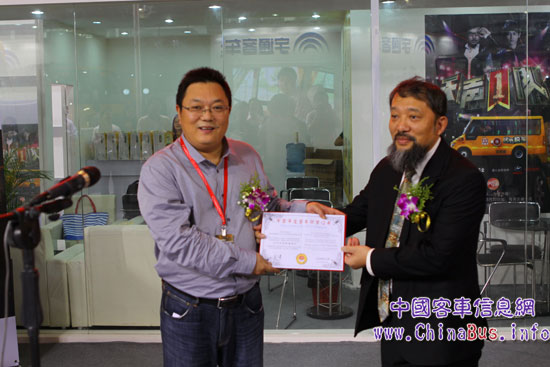 王健主編向梁建斌副總經(jīng)理頒發(fā)2012中國年度客車大獎(jiǎng)證書