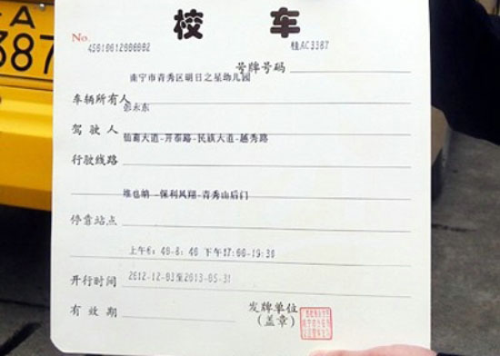 南寧一校車昨領(lǐng)到校車標(biāo)牌