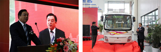 恒通客車(chē)總經(jīng)理鄭先國(guó)發(fā)表講話(huà)          渝北區(qū)區(qū)長(zhǎng)黃玉林與鄭先國(guó)總經(jīng)理為新車(chē)揭幕