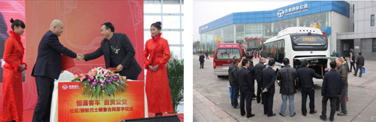 恒通客車(chē)黨委副書(shū)記、副總經(jīng)理蔣更新與自貢公交簽約銷(xiāo)售合同(左圖)