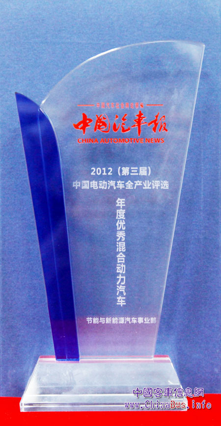 2012年12月11日,由《中國汽車報》、汽車網(wǎng)主辦,中國汽車工業(yè)國際合作公司協(xié)辦,中國汽車工業(yè)協(xié)會、中國汽車工業(yè)學會等多家提供支持,以“匯聚正能量”為主題的2012年(第三屆)中國電動汽車全產(chǎn)業(yè)評選頒獎盛典在上海隆重開幕。行業(yè)內(nèi)包括海格客車在內(nèi)的眾多知名電動汽車企業(yè)齊聚現(xiàn)場,分享電動行業(yè)的最新研究成果,其中海格燃氣混合動力客車KLQ6109GCHEV1A榮獲年度優(yōu)秀混合動力汽車大獎。