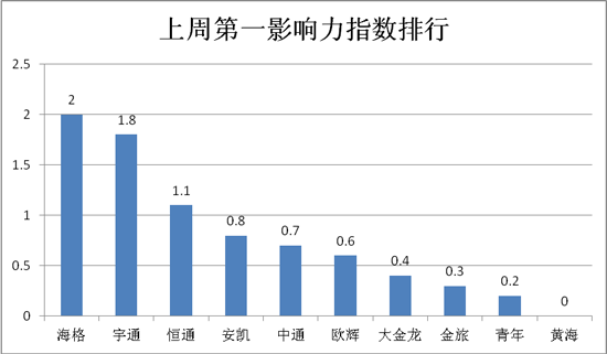 就第一影響力指數(shù)得分而言,上周2分以上的特優(yōu)傳播企業(yè)僅有海格一家;1~2分之間的績優(yōu)傳播企業(yè)有宇通和恒通2家;位于1分之下的有大金龍、安凱、中通、歐輝、黃海、青年和金旅7家客車企業(yè)。