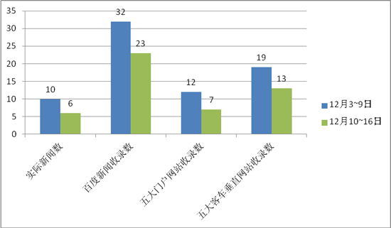 從第一影響力指數(shù)各項(xiàng)指標(biāo)來看,上周七家客車企業(yè)實(shí)際新聞總數(shù)為28條,平均每家4條;在5家客車垂直網(wǎng)站的收錄上,七家客車企業(yè)有24條相關(guān)新聞,平均每家約3條;在百度新聞收錄中,七家客車企業(yè)共有62條相關(guān)新聞,平均每家約9條。