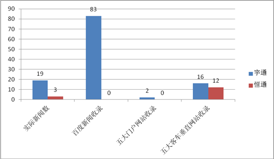 上周,這兩家車企的第一影響力各項(xiàng)指標(biāo)相比較,恒通在各個(gè)方面都略顯弱勢,特別是在百度新聞收錄和五大門戶網(wǎng)站收錄這兩項(xiàng)指標(biāo)上都為零,險(xiǎn)些讓其跌入績差傳播企業(yè);好在其在五家客車垂直媒體收錄中依然有一定的數(shù)量(12條),才以微弱優(yōu)勢保持在績優(yōu)傳播陣營中。