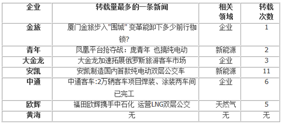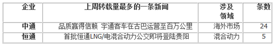 上周,兩家客車企業(yè)轉(zhuǎn)載量最多的一條新聞詳見下表: