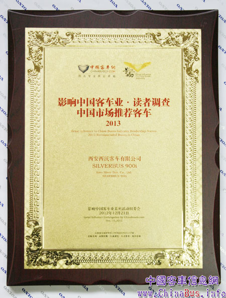 2012年12月21日,“第七屆影響中國(guó)客車(chē)業(yè)2012—2013年度客車(chē)行業(yè)讀者調(diào)查評(píng)選活動(dòng)”頒獎(jiǎng)典禮在北京大紅門(mén)國(guó)際會(huì)展中心隆重舉行,西沃客車(chē)憑借2012年的優(yōu)秀表現(xiàn),以安全可靠的產(chǎn)品、陽(yáng)光健康的形象、良好的市場(chǎng)口碑,西沃900i客車(chē)獲頒“2013年度中國(guó)市場(chǎng)推薦車(chē)型”,西沃校車(chē)獲頒“2013年度專用校車(chē)推薦車(chē)型”。