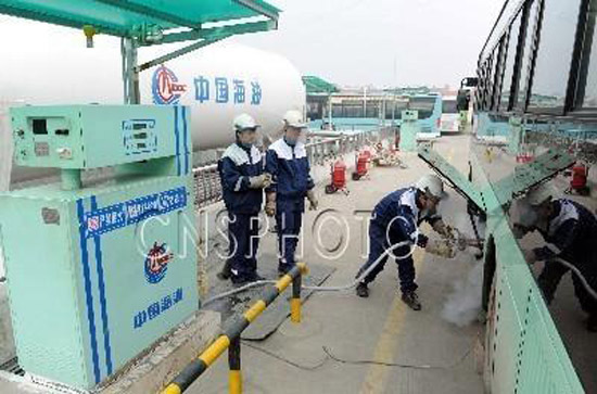 1月12日,在安徽省銅陵市公交公司液化天然氣(LNG)加氣站,加氣工人正在為一輛公交車加氣。據(jù)中海油銅陵新能源有限公司相關(guān)負(fù)責(zé)人介紹,銅陵現(xiàn)在有58輛LNG公交車用上了清潔、高效的液化天然氣。中海油銅陵新能源有限公司將在銅陵布局7座LNG加氣站,讓更多的車輛能夠用上LNG,以此促進(jìn)節(jié)能減排,建設(shè)綠色交通。