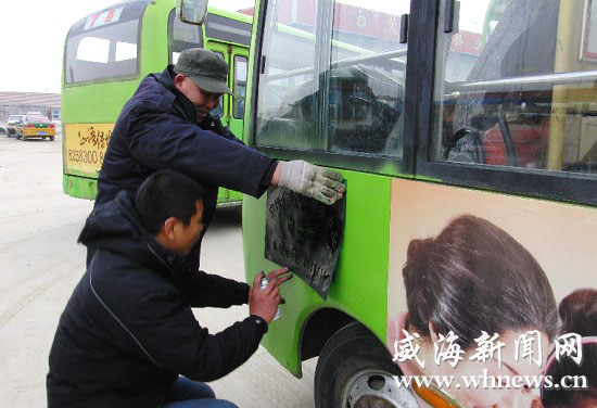 1月15日,公交車業(yè)主在張貼監(jiān)督電話,方便乘客監(jiān)督。