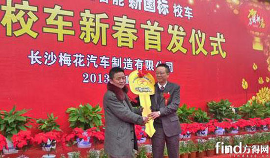 2013年2月16日上午,長沙梅花汽車制造有限公司前坪嘉賓云集,彩球飄揚。由長沙梅花汽車制造有限公司精心打造的“同心金象安全智能新國標(biāo)”百輛校車在這里舉行了隆重的新春首發(fā)儀式。