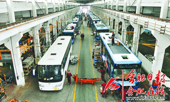昨日,在安凱客車生產(chǎn)車間,工人們正在生產(chǎn)新能源客車。據(jù)悉,此次生產(chǎn)的150輛新能源客車將在本月底交付合肥公交集團??蛙嚥捎萌碌臍怆娀旌蟿恿?,節(jié)氣率將提高30%以上。截至目前,合肥市共推廣運營純電動客車600余輛,在全國新能源汽車試點城市中名列前茅。