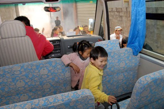 孩子們乘“大鼻子”,在園門口迎接的西郊啟蒙幼兒園園長(zhǎng)安從會(huì)安心地笑了。