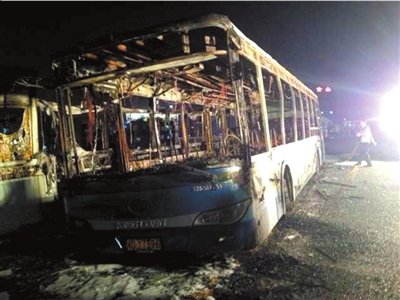 記者在現(xiàn)場(chǎng)看到,在距離地面約10米高的快速公交道上,一輛公交車被燒得只剩下車架,一側(cè)的車道擋板燒了大約9米。