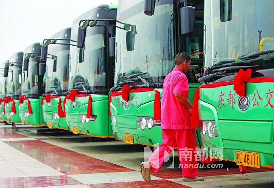 這條全程53公里的跨縣(區(qū))公交線,連接惠州市火車站和惠東汽車站,使惠東成為惠州第3個(gè)開通跨縣區(qū)公交的縣區(qū)。昨日上午,在惠州火車站站前廣場(chǎng)上,D 1路公交舉行了開通儀式。30輛深綠色的宇通LN G公交車圍成一個(gè)圈,統(tǒng)一掛著“惠州火車站 D 1 惠東汽車站”的標(biāo)牌和大紅綬帶。