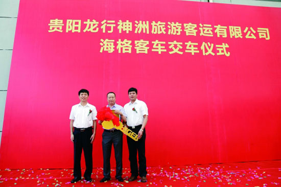 7月8日,貴陽龍行神洲旅游客運有限公司海格客車交車儀式在蘇州舉行,海格客車黨委領(lǐng)導(dǎo)劉立杰向龍行神洲公司董事長龍明成贈送了象征成功與財富的“金鑰匙”。此次交付的100輛海格KLQ6122系列客車為海格新H系代表車型,被指定為將于7月19日—21日舉行的生態(tài)文明貴陽國際論壇2013年年會專用車輛。