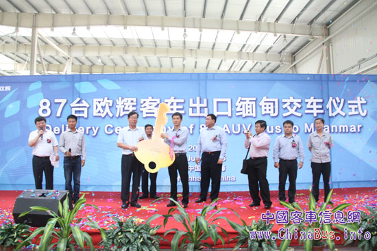 7月13日,在福田歐輝客車廣東工廠舉辦了87臺歐輝客車出口緬甸交車儀式。福田汽車集團(tuán)副總裁、歐輝客車事業(yè)部總經(jīng)理解佃峰將一把象征著出口緬甸奧肯博公司的歐輝客車模型鑰匙交到了奧肯博公司董事長姜建華的手中,標(biāo)志著“福田歐輝客車出口緬甸奧肯博公司大客車交車儀式”取得圓滿成功。