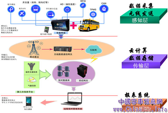 之后,通過傳輸層的數(shù)據(jù)存儲(chǔ)處理及云計(jì)算,這些數(shù)據(jù)就將在應(yīng)用層形成報(bào)表系統(tǒng)及數(shù)據(jù)的智能分析,此時(shí)遠(yuǎn)程實(shí)時(shí)管理系統(tǒng)將會(huì)以報(bào)表化形式顯示在G-BOS網(wǎng)頁,而且可以將學(xué)生上下車的即時(shí)信息以短信發(fā)送家長,方便家長接送孩子。這套系統(tǒng)的運(yùn)營將有效整合人、車、線管理,切實(shí)有效地監(jiān)管校車實(shí)際運(yùn)營的全過程。
