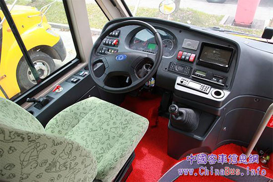 車廂內(nèi)飾采用了米色為主,座椅則采用綠色絨面卡通花紋裝飾。該車的座椅采用了一體式雙座椅,寬76 cm,深37 cm,靠背高71.5 cm,坐墊上沿?fù)?jù)地板高度36 cm,前后排間距75 cm,膝部間距30 cm。這種座椅空間設(shè)計(jì)基本能夠買足多數(shù)學(xué)生的乘坐舒適性。