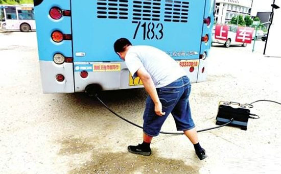 檢測(cè)人員正在用專業(yè)儀器“尾氣檢測(cè)槍”,抽檢公交車的尾氣排放