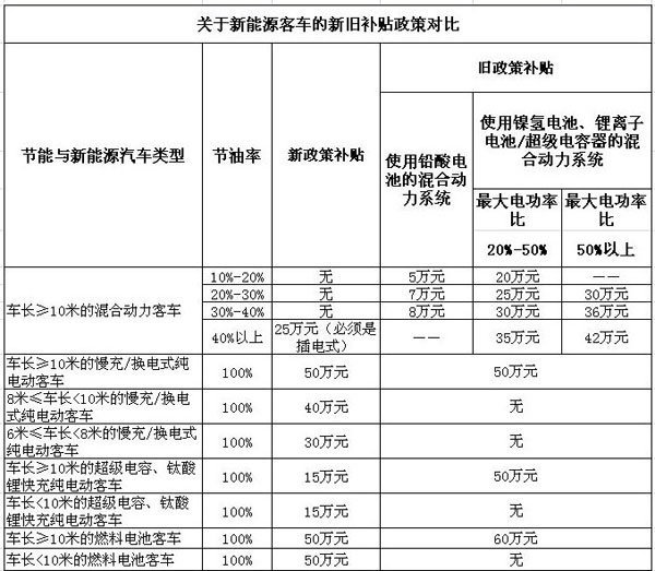 新老政策對比 混合動力客車補貼下降