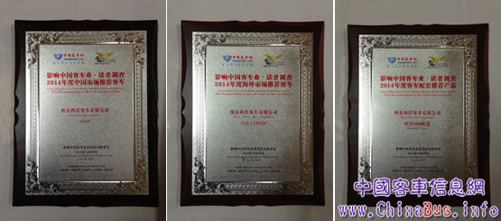 2013年12月20日,第八屆"影響中國(guó)客車(chē)業(yè)"調(diào)查評(píng)選頒獎(jiǎng)盛典在北京隆重舉行,西沃客車(chē)產(chǎn)品系列中:volvo9300榮獲"2014年中國(guó)市場(chǎng)推薦客車(chē)"、西沃900i榮獲"2014年海外市場(chǎng)推薦客車(chē)"、西沃900底盤(pán)榮獲"2014年度客車(chē)配套推薦產(chǎn)品"三項(xiàng)大獎(jiǎng)。
