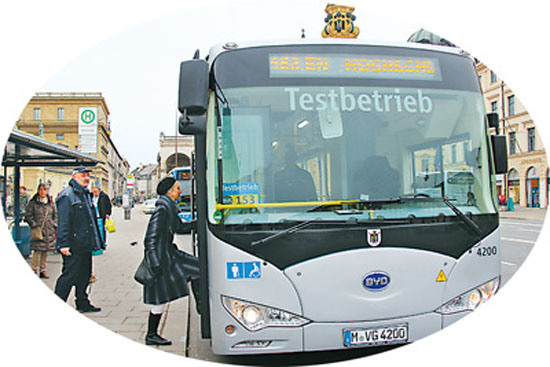 近日,記者來(lái)到德國(guó)南部城市慕尼黑,一輛中國(guó)比亞迪公司生產(chǎn)的純電動(dòng)公交車在這里進(jìn)行試運(yùn)行。從慕尼黑市中心的音樂(lè)廳廣場(chǎng)地鐵站出來(lái),就看見(jiàn)153路公交車站??恐惠v外貌與眾不同的公交車。除了車身四周都標(biāo)注著“試運(yùn)行”之外,車尾部的“電動(dòng)汽車”標(biāo)識(shí)格外顯眼。