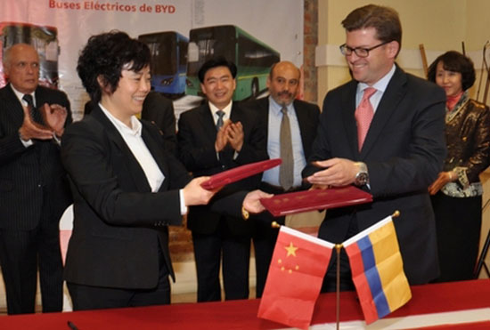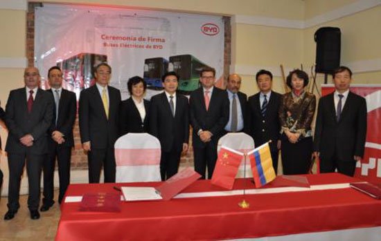 作為哥倫比亞首都波哥大推廣綠色交通的一部分,比亞迪與波哥大公交運營商Coobus簽署諒解備忘錄,將根據(jù)電動巴士的性能測試結果批準260輛比亞迪電動巴士(12米)在波哥大的推廣。比亞迪同時還與哥倫比亞公交服務公司Consorcio Express簽署比亞迪18米鉸接式純電動巴士推廣的諒解備忘錄。中國駐哥倫比亞大使汪曉源、深圳市委書記王榮,以及哥倫比亞相關政府官員出席了簽約儀式。
