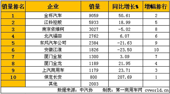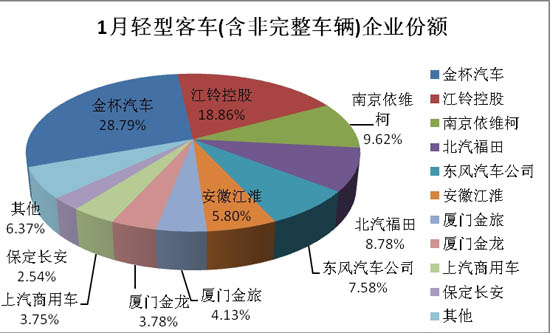 1月份,輕型客車(含非完整車輛)銷售31462輛,銷量排名前十的企業(yè)共計銷售29459輛,占據(jù)整個輕型客車(含非完整車輛)銷量份額的93.63%。排名如下: