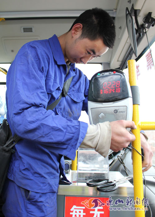 工作人員正在安裝公交IC卡刷卡系統(tǒng)
