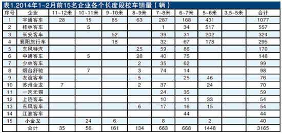 前15家企業(yè)總計銷售3165輛,占據(jù)了校車市場總量的98.11%。具體來說,1~2月,校車銷量超過100輛的有宇通客車、長安客車、東風(fēng)襄陽旅行車、桂林客車、東風(fēng)特汽、中通客車6家。其中,宇通銷量最大,達(dá)到1077輛,占據(jù)了校車市場33.4%的市場份額,比去年同期19.57%的份額提高了近13.3個百分點(diǎn),說明市場更加壟斷(見表1)。