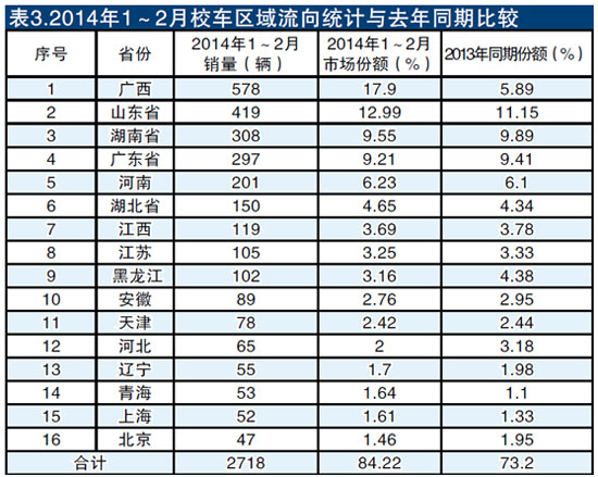 此外,從1~2月校車銷售流向可以看出,這兩個月的校車銷售區(qū)域分布不均衡,集中度有較大幅度提高,壟斷程度進(jìn)一步加強(qiáng)。前15名區(qū)域的市場集中度達(dá)到84.22%,比去年同期提高了近11%。其中,廣西市場份額最大,提升幅度也最大;黑龍江市場份額降幅最大。